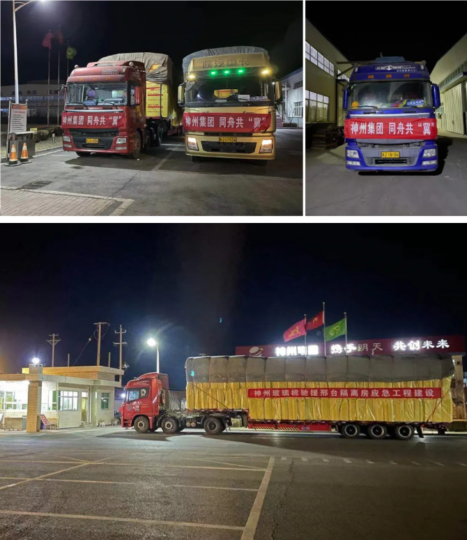 一辆辆满载着神州玻璃棉的隔离房用保温材料运输车,从神州集团玻璃棉B区紧急驶出,连夜踏上了驰援邢台隔离房应急工程建设的征途。